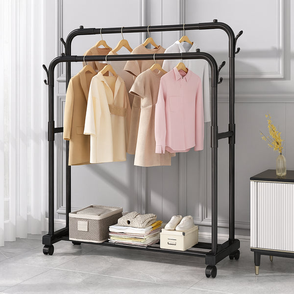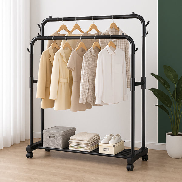 Praktičan i izuzetno čvrst dvostruki stalak za odeću sa točkićima, idealan za svaki dom.